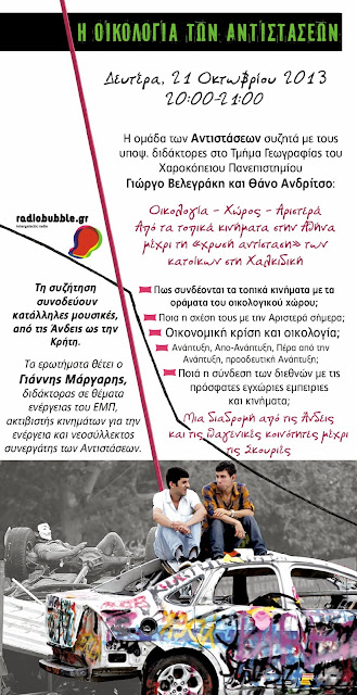 Η αποψινή εκπομπή (δευτερα): Απο τα τοπικα κινήματα στην Αθήνα μέχρι την ''χρυσή αντίσταση'' των κατοίκων της Χαλκιδικής - Η ομαδα των ''Αντιστάσεων'' συζητάει με τους υποψ.διδακτορες ττου Χαροκόπειου Πανεπιστημίου Γ.Βελεγράκη και Θ.Ανδρίτσο και εγκαινιάζει το ραδιοφωνικο ένθετο ''Η Οικολογία των Αντιστάσεων''